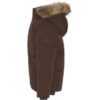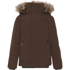 Herbert is a brown winter jacket with a detachable hood with a detachable faux fur trim. It has a covered front zip closure and storm flaps at the sleeves and bottom. The jacket is lined in technical down, called pearl padding, which makes it extra soft, retains heat and has a down-like feel. This product has a water-resistant, PFC-free surface treatment (Does not contain, e.g. PFOS, PFOA, etc). Water column pressure: 10.000 mm. Breathable: 8.000 g/m2/24hr.