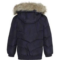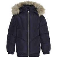 Heylee is a dark blue winter jacket with a black peacock feather print. It has a detachable hood with a faux fur trim (also detachable). The jacket has side pockets and rib at the sleeves. Heylee is filled with pearl padding to give it extra softness and a down-like feeling. The outer fabric has a water resistant, PFC-free surface treatment (Does not contain, e.g. PFOS, PFOA, etc).