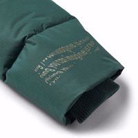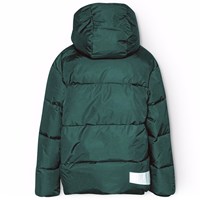 Petrol green puffer jacket in recycled polyester perfect for a cold winter. It has a detachable hood, side pockets and sleeves with ribbed cuffs, which effectively keep out wind, snow, and rain while ensuring that gloves stay in place. The jacket has a large reflector on the back to increase visibility in traffic.