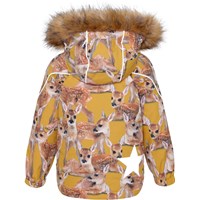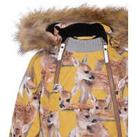 Hopla Fur is a functional and waterproof winter jacket in yellow with a print of small deer. The jacket's lining and interlining are recycled and made from recycled polyester. It has a detachable hood with a detachable faux fur edge, slanted zippers on the front, rib at the neck, elastic at the sleeves and Molo's iconic star reflectors on both upper sleeves and at the bottom of the back. The jacket also has high quality fleece at vulnerable spots and it has taped seams. This product has a water resistant, PFC-free surface treatment (Does not contain, e.g. PFOS, PFOA, etc). Water column pressure: 15.000 mm. breathable: 15.000 g/m2/24hr. They have straps with velcro for braces that can be purchased.