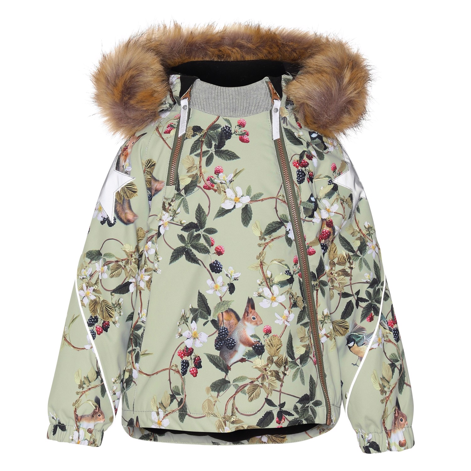 Hopla Fur is a functional and waterproof winter jacket in green with a print of berries and flowers. Hopla Fur is perfect for extremely cold days but also ordinary winter days. The high level of breathability helps regulate a child's body temperature so it does not become too cold or over heated. On warmer winter days, a child can wear the jacket with a thin under layer, but on extremely cold days, you can add an extra layer underneath. Hopla Fur is also a good choice for less active moments.The jacket has a detachable hood with a faux fur edge (also detachable), slanted front zip closure, rib at the neck, elastic at the sleeves and Molo's iconic star reflectors on the upper sleeves and the bottom on the back. The jacket also has high quality fleece in vulnerable places, and it has taped seams. The outer fabric is made from 45% recycled polyester, the 3M™ Thinsulate™ padding from 78% recycled polyester and the lining from 100% recycled polyester. This product has a water resistant, PFC-free surface treatment (Does not contain, e.g. PFOS, PFOA, etc). Water column pressure: 15.000 mm. Breathable: 15.000 g/m2/24hr.
