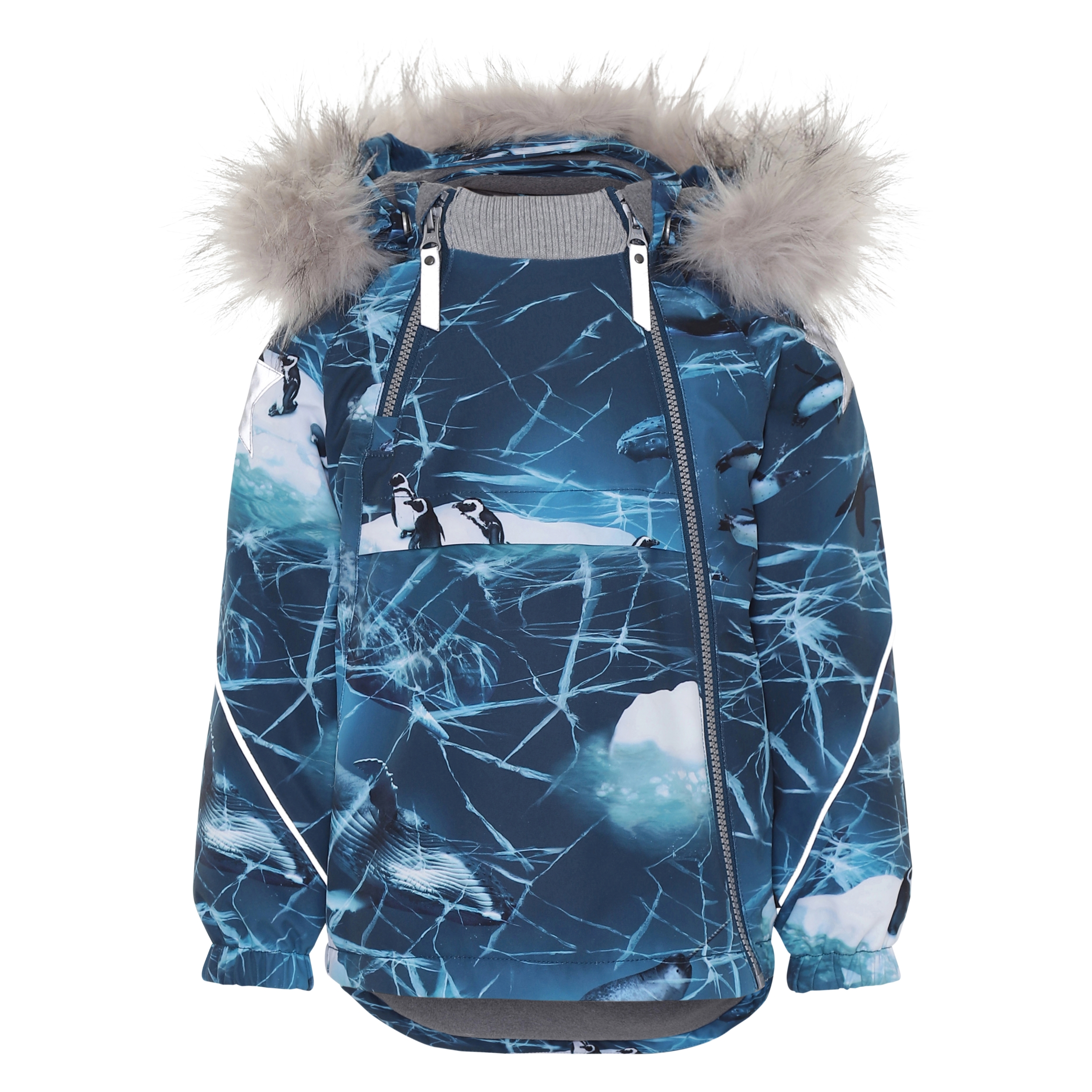 Hopla Fur is a functional and waterproof winter jacket in Molo's 'Frozen Ocean' print. It has a detachable hood with a faux fur edge (also detachable), a slanted front zip, rib at the neck and elastic at the sleeves. The jacket has Molo's iconic star reflector on both upper sleeves and at the bottom of the back. The jacket is constructed in a windproof, waterproof and breathable fabric and lined in 3M™ Thinsulate™. It has a high quality fleece at vulnerable areas, and the seams are taped. This product has a water resistant, PFC-free surface treatment (Does not contain, e.g. PFOS, PFOA, etc). Water column pressure: 10.000 mm. Breathable: 8.000 g/m2/24hr.