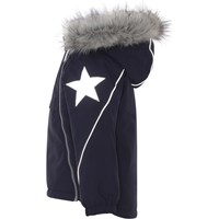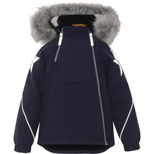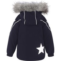Hopla Fur is a functional and waterproof winter jacket in blue. Hopla Fur is perfect for extremely cold days but also ordinary winter days. The high level of breathability helps regulate a child's body temperature so it does not become too cold or over heated. On warmer winter days, a child can wear the jacket with a thin under layer, but on extremely cold days, you can add an extra layer underneath. Hopla Fur is also a good choice for less active moments.The jacket has a detachable hood with a faux fur edge (also detachable), slanted front zip closure, rib at the neck, elastic at the sleeves and Molo's iconic star reflectors on the upper sleeves and the bottom on the back. The jacket also has high quality fleece in vulnerable places, and it has taped seams. The outer fabric is made from 59% recycled nylon, the 3M™ Thinsulate™ padding from 78% recycled polyester and the lining from 100% recycled polyester. This product has a water resistant, PFC-free surface treatment (Does not contain, e.g. PFOS, PFOA, etc). Water column pressure: 15.000 mm. Breathable: 15.000 g/m2/24hr.