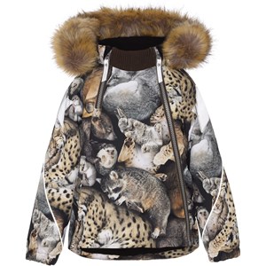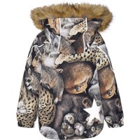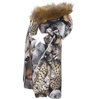 Hopla Fur is a functional and waterproof winter jacket in a print of sleeping animals. Hopla Fur is perfect for extremely cold days but also ordinary winter days. The high level of breathability helps regulate a child's body temperature so it does not become too cold or over heated. On warmer winter days, a child can wear the jacket with a thin under layer, but on extremely cold days, you can add an extra layer underneath. Hopla Fur is also a good choice for less active moments.The jacket has a detachable hood with a faux fur edge (also detachable), slanted front zip closure, rib at the neck, elastic at the sleeves and Molo's iconic star reflectors on the upper sleeves and the bottom on the back. The jacket also has high quality fleece in vulnerable places, and it has taped seams. The outer fabric is made from 45% recycled polyester, the 3M™ Thinsulate™ padding from 78% recycled polyester and the lining from 100% recycled polyester. This product has a water resistant, PFC-free surface treatment (Does not contain, e.g. PFOS, PFOA, etc). Water column pressure: 15.000 mm. Breathable: 15.000 g/m2/24hr.