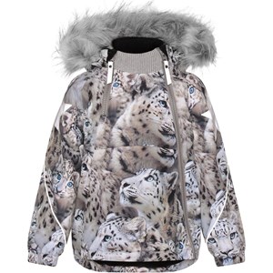 Hopla Fur is a functional and waterproof winter jacket in grey with a print of snow leopards. The jacket's lining and interlining are recycled and made from recycled polyester. It has a detachable hood with a detachable faux fur edge, slanted zippers on the front, rib at the neck, elastic at the sleeves and Molo's iconic star reflectors on both upper sleeves and at the bottom of the back. The jacket also has high quality fleece at vulnerable spots and it has taped seams. This product has a water resistant, PFC-free surface treatment (Does not contain, e.g. PFOS, PFOA, etc). Water column pressure: 15.000 mm. breathable: 15.000 g/m2/24hr. They have straps with velcro for braces that can be purchased.