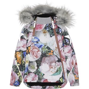Hopla Fur is a functional, waterproof winter jacket with a floral print. Hopla Fur is perfect for extremely cold days but also ordinary winter days. The high level of breathability helps regulate a child's body temperature so it does not become too cold or over heated. On warmer winter days, a child can wear the jacket with a thin under layer, but on extremely cold days, you can add an extra layer underneath. Hopla Fur is also a good choice for less active moments.The jacket has a detachable hood with a faux fur edge (also detachable), slanted front zip closure, rib at the neck, elastic at the sleeves and Molo's iconic star reflectors on the upper sleeves and the bottom on the back. The jacket also has high quality fleece in vulnerable places, and it has taped seams. The outer fabric is made from 45% recycled polyester, the 3M™ Thinsulate™ padding from 78% recycled polyester and the lining from 100% recycled polyester. This product has a water resistant, PFC-free surface treatment (Does not contain, e.g. PFOS, PFOA, etc). Water column pressure: 15.000 mm. Breathable: 15.000 g/m2/24hr.