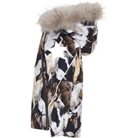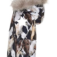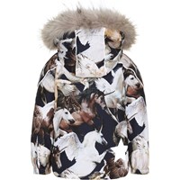 Hopla Fur is a functional and waterproof winter jacket in Molo's 'Unicorn and Pegasus' print. It has a detachable hood with a faux fur edge (also detachable), a slanted front zip, rib at the neck and elastic at the sleeves. The jacket has Molo's iconic star reflector on both upper sleeves and at the bottom of the back. The jacket is constructed in a windproof, waterproof and breathable fabric and lined in 3M™ Thinsulate™. It has a high quality fleece at vulnerable areas, and the seams are taped. This product has a water resistant, PFC-free surface treatment (Does not contain, e.g. PFOS, PFOA, etc). Water column pressure: 10.000 mm. Breathable: 8.000 g/m2/24hr.