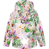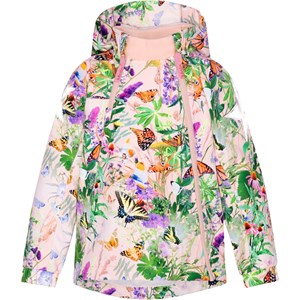 Pink, lightweight anorak-looking jacket that is partially constructed in recycled polyester in an all over print of wildflowers and flapping butterflies. The jacket has a standing collar with soft rib, a detachable hood, diagonal zip closure with chin protection, elastic sleeve openings and adjustable elastic at the hips. There is a reflective band on the back and large, reflective stars on the back and on the sleeves, which makes the jacket more visible in traffic.The jacket has taped seams and a high level of waterproofing, which means it can withstand an unexpected downpour. The high level of breathability allows heat and moisture to escape, which keeps the child dry and comfortable, even in warm weather or during high levels of physical activity. The jacket has been treated with a water and dirt-repellent coating that does not contain chemicals like PFOS, PFOA, etc. Water column pressure: 12.000mm. Breathability: 8.000 g/m²/24hr.