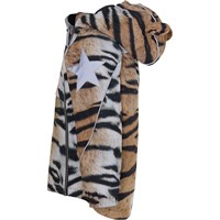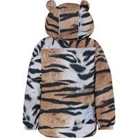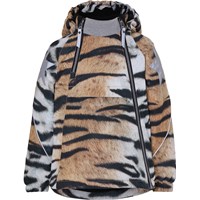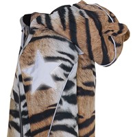 Hopla is a waterproof winter jacket in a tiger print. It has a detachable hood, a slanted zipper down the front, rib at the neck, elastic at the sleeves and Molo's iconic star reflector on both upper sleeves and on the back bottom. The jacket is constructed in a windproof and waterproof quality that is breathable. It is lined in 3M™ Thinsulate™ and has high quality fleece in vulnerable places as well as taped seams. This product has a water resistant, PFC-free surface treatment (Does not contain, e.g. PFOS, PFOA, etc). The water column pressure and breathability are improved and are now 15.000 mm for the water column pressure and breathability: 15.000 g/m2/24hrs. Note that it is only from sizes 80-104 that have sewn-on ears