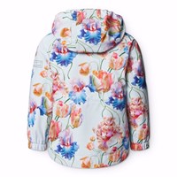 Light blue windproof and waterproof jacket in recycled polyester with a colourful all-over print of artistic tulips. The jacket features a detachable hood, pockets with wind flaps, a zipper with chin guard and inner wind flap, and elastic cuffs to effectively keep out the wind. Inside, it has an adjustable elastic at the waist to adjust the silhouette and fit of the jacket. The technical features of the jacket make it suitable as a raincoat.