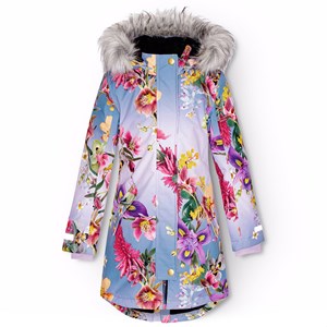 Wind- and waterproof winter jacket in recycled polyester for a cold winter with a print of beautiful flowers in fresh colours on a blue and purple background. The jacket is knee-length and has an elastic in the back, providing a tailored fit. It also has a detachable lined hood with a removable faux fur trim and a zipper with a flap to keep out snow, wind, and water. The jacket has several large reflector to increase visibility in traffic. There are lined pockets with pocket flaps, a zippered chest pocket, and an inner pocket. The sleeves have ribbed cuffs which effectively keepis out wind, snow, and rain while ensuring that gloves stay in place. The jacket is lined with fleece and 3M™ Thinsulate™, which is lightweight and provides greater mobility for the child.