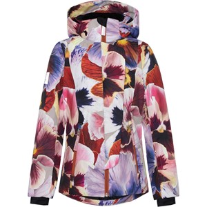 Pearson is a functional, waterproof ski jacket in a print of large flowers in warm colours. lyseblå med print af farvede grene. Pearson has a detachable hood and a zip front closure with an asymmetric shaped placket. It has side pockets and adjustable sleeve openings with a snug storm flap and thumb holes and reflective stripes on the sleeves. The jacket is made in a windproof, waterproof and breathable fabric with taped seams. The lining and interlining are recycled and made of recycled polyester. This product has a water resistant, PFC-free surface treatment (Does not contain, e.g. PFOS, PFOA, etc). Water column pressure: 15.000 mm. breathable: 15.000 g/m2/24hr. They have straps with velcro for braces that can be purchased.