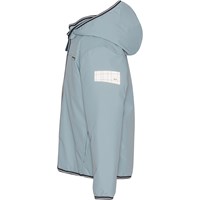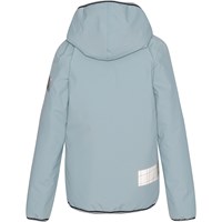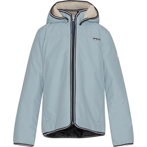 Waterproof jacket in light blue with taped seams and padding, making it highly suitable as rainwear during the cold autumn and winter months. The jacket also functions as everyday outerwear during transitional periods when the weather can be very unpredictable. The jacket has a front zipper, a detachable fleece-lined hood, side pockets, and reflectors on the back and sleeve. Water column pressure: 5,000 mm. Breathability: 5,000 g/m²/24h.
