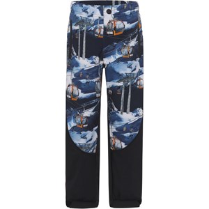 Haemon are Molo's new softshell trousers in blue and black with a print of ski lifts. They are extremely comfortable and completely practical. They have an adjustable waist so they fit all children perfectly. The outer fabric is windproof, waterproof and breathable. The lining and interlining are recycled and made of recycled polyester. This product has a water resistant, PFC-free surface treatment (Does not contain, e.g. PFOS, PFOA, etc). Water column pressure: 8.000 mm. breathable: 5.000 g/m2/24hr.