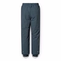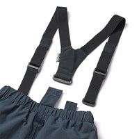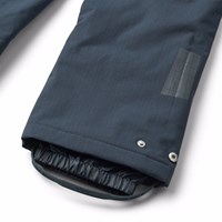 Dark blue wind and waterproof trousers made of recycled nylon. The trousers have elastic around the waist as well as an internally adjustable elastic, belt loops for Molos braces (extra accessory), and adjustable leg openings with snow gaiters. The trousers have a large reflector on the back that increase the visibility in traffic.
