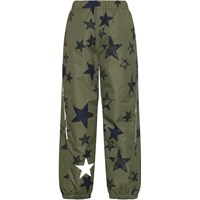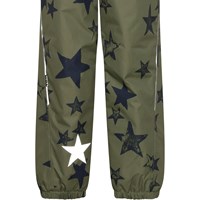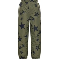Paxton is a pair of Molo's new rain trousers in green with a star print. Paxton is windproof, waterproof and breathable with taped seams. The lining and interlining are 100% recycled and made of recycled plastic bottles. They have a snap and zipper closure at the waist, pockets at the sides and adjustable leg openings with snow flaps. They also have reinforcement on the inside of the legs. This product has a water resistant, PFC-free surface treatment (Does not contain, e.g. PFOS, PFOA, etc). Water coloumn pressure: 12.000 mm and breathable: 8.000 g/m2/24hr.