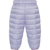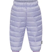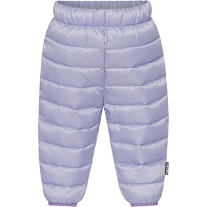 Purple puffer down trousers for smaller children. The trousers are in a roomy fit and has an elastic waist, and snug leg openings. They are padded with imitated down filling called Pearl Padding, which provides consistent softness, retains heat well, and makes washing easier.