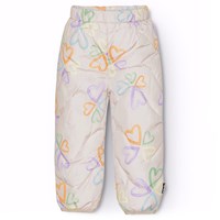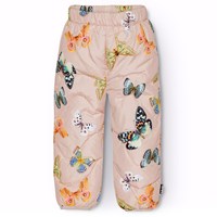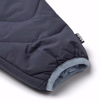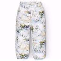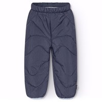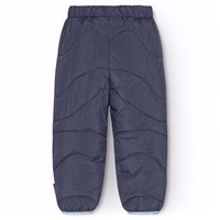 Water-repellent dark blue thermal trousers for the babies and toddlers with light blue trim. The trousers have a spacious fit, an elastic waist with an adjustable elastic band, and a snug leg opening .The trousers are made of recycled nylon, and the padding is made of recycled polyester. The water-repellent surface is free from PFOS and PFOA. Combine with a matching jacket and get a warm and soft thermal set.