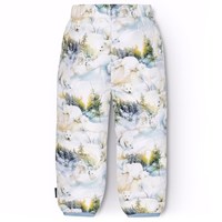 Water-repellent thermal trousers for the babies and toddlers with light blue trim. The trousers have a spacious fit, an elastic waist with an adjustable elastic band, and a snug leg opening. The trousers has an allover print of a snowy landscape with playful polar bears. Trousers and padding are made of recycled polyester. The water-repellent surface is free from PFOS and PFOA. Combine with a matching jacket and get a warm and soft thermal set.