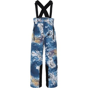 Play Pro is a pair of waterproof ski trousers in blue with an astronaut print. They have a high waist, a zip closure, adjustable braces, side pockets, adjustable leg openings with snow flaps and extra reinforcement at the inner legs and on the back. The outer fabric is made from 45% recycled polyester, the 3M™ Thinsulate™ padding from 83% recycled polyester and the lining from 100% recycled polyester. This product has a water resistant, PFC-free surface treatment (Does not contain, e.g. PFOS, PFOA, etc). Water column pressure: 15.000 mm. Breathable: 15.000 g/m2/24hr.