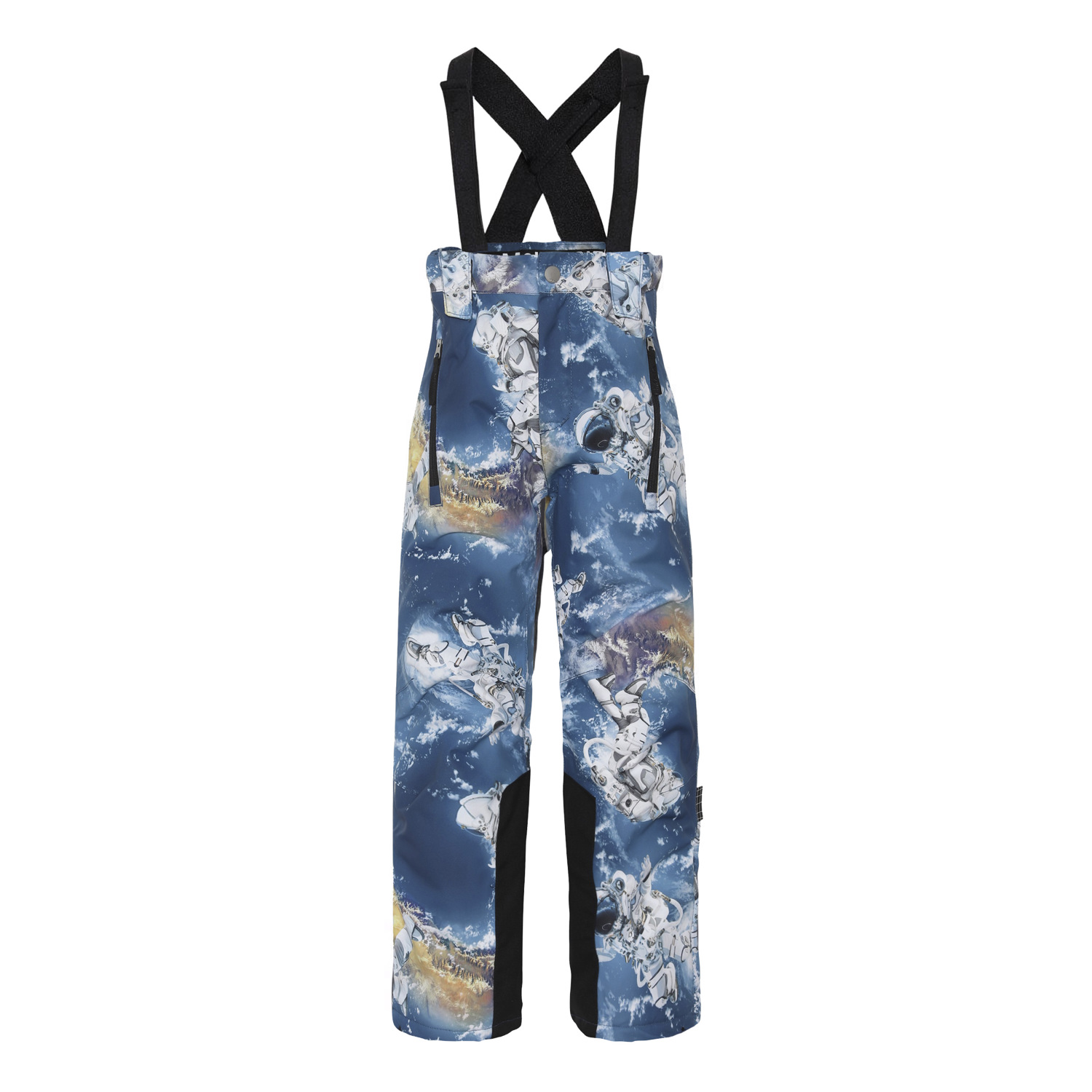 Play Pro is a pair of waterproof ski trousers in blue with an astronaut print. They have a high waist, a zip closure, adjustable braces, side pockets, adjustable leg openings with snow flaps and extra reinforcement at the inner legs and on the back. The outer fabric is made from 45% recycled polyester, the 3M™ Thinsulate™ padding from 83% recycled polyester and the lining from 100% recycled polyester. This product has a water resistant, PFC-free surface treatment (Does not contain, e.g. PFOS, PFOA, etc). Water column pressure: 15.000 mm. Breathable: 15.000 g/m2/24hr.