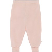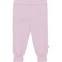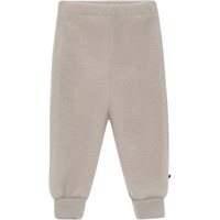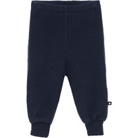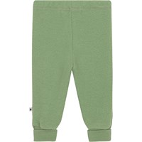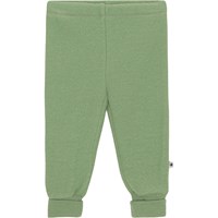 Green pants for smaller children in soft fleece made from 100% merino wool. The pants are highly suitable as outerwear when taking a walk in the stroller during the cold autumn and winter month or indoors when children play and tumble on the floor. They have a roomy fit with elastic at the waist and snug ribbed cuffs with folded edges at the legs.