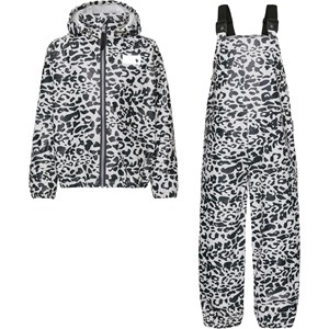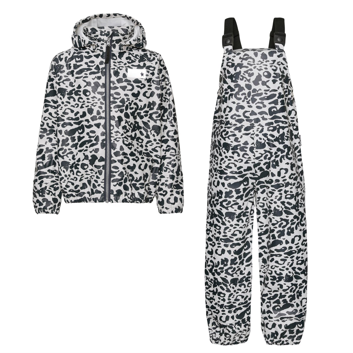 Wade is a rainwear set that has a rain jacket and a pair of rain trousers in a blue and white leopard print. The jacket has a detachable hood and a zip front closure. The trousers have a bib, adjustable braces and elastic at the legs. Both the jacket and the trousers have Molo''s iconic star reflectors on the back. This product has a water-resistant, PFC-free surface treatment (Does not contain,e.g. PFOS, PFOA, etc). Water column pressure: 8.000 mm.