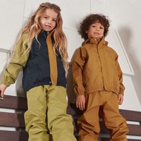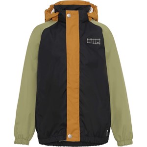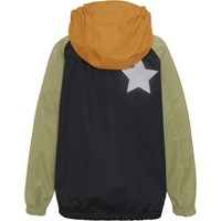 Waiton is a lightweight and functional rain jacket in a colourful mix of black, moss green and golden yellow with nylon lining. Waiton has a covered zipper to protect against the wind and rain. It has taped seams, detachable hood and two front pockets. The jacket has Molo's iconic star reflector on the back to make the child more visible in the dark. This rainwear has a huge advantage in that it is breathable, so a high activity level won't make the jacket wet inside. This product has a water resistant, PFC-free surface treatment (Does not contain, e.g. PF OS, PFOA, etc). Water column pressure: 5.000 mm. breathable: 5.000 g/m2/24hr.
