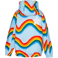 Light blue rain jacket in an all over print of wavy rainbows. It is constructed in a lightweight, breathable quality that prevents condensation and moisture from forming on the inside of the jacket, even during high levels of activity. The jacket has a detachable hood, two front pockets, elastic at the wrists and bottom and a covered zip closure to protect against wind and rain. There is a large star reflector on the back of the jacket to make the child more visible in traffic. The jacket has taped seams to avoid water leaking in from the outside. Water column pressure: 5.000 mm. Breathability: 5.000 g/m2/24hrs.