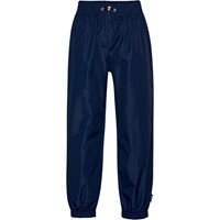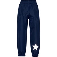 Dark blue rain trousers in a lightweight, breathable quality that prevents condensation and moisture from forming on the inside of the trousers, even during high levels of activity. The rain trousers have an adjustable elastic waist and elastic at the legs. One of the trouser legs has a large star reflector on the back to make the child more visible in traffic. All the seams are taped to prevent water leaking in from the outside. Water column pressure: 5.000 mm. Breathability: 5.000 g/m2/24hrs.