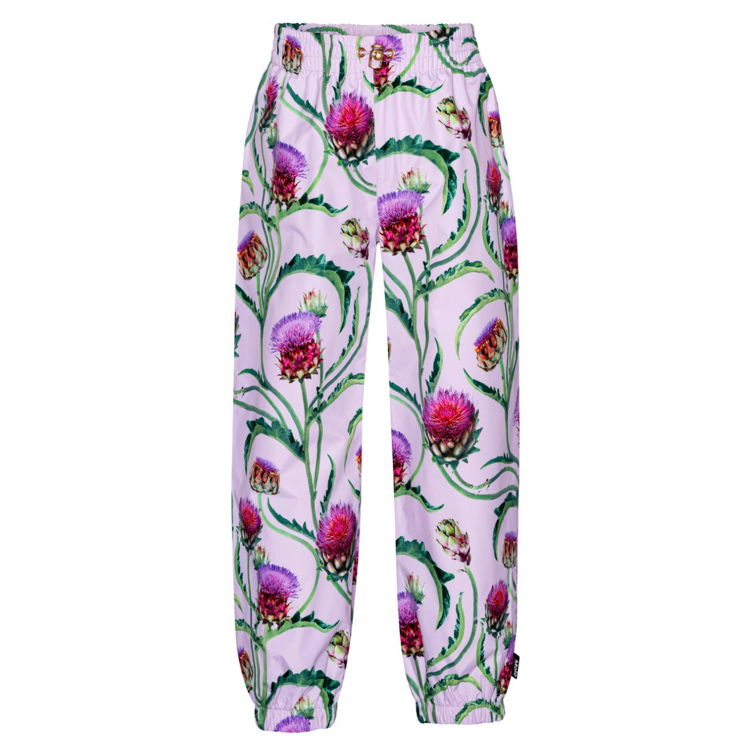 Pink rain trousers in an all over print of blooming artichoke flowers. The rain trousers are constructed in a lightweight, breathable quality that prevents condensation and moisture from forming on the inside of the trousers, even during high levels of activity. The rain trousers have an adjustable elastic waist and elastic at the legs. One of the trouser legs has a large star reflector on the back to make the child more visible in traffic. All the seams are taped to prevent water leaking in from the outside. Water column pressure: 5.000 mm. Breathability: 5.000 g/m2/24hrs.