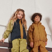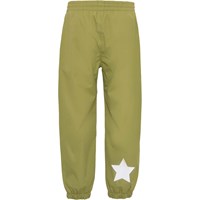 Waits is a pair of lightweight and funtional rain trousers in moss green. They have taped seams, adjustable elastic at the legs and waist and Molo's iconic star reflector on one leg. This rainwear has a huge advantage in that it is breathable, so a high activity level won't make the trousers wet inside. This product has a water resistant, PFC-free surface treatment (Does not contain, e.g. PF OS, PFOA, etc). Water column pressure: 5.000 mm. breathable: 5.000 g/m2/24hr.
