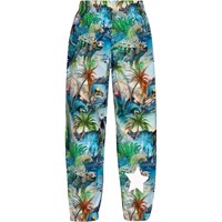 Rain trousers in an all over dinosaur print in shades of blue and green. The rain trousers are constructed in a lightweight, breathable quality that prevents condensation and moisture from forming on the inside of the trousers, even during high levels of activity. The rain trousers have an adjustable elastic waist and elastic at the legs. One of the trouser legs has a large star reflector on the back to make the child more visible in traffic. All the seams are taped to prevent water leaking in from the outside. Water column pressure: 5.000 mm. Breathability: 5.000 g/m2/24hrs.