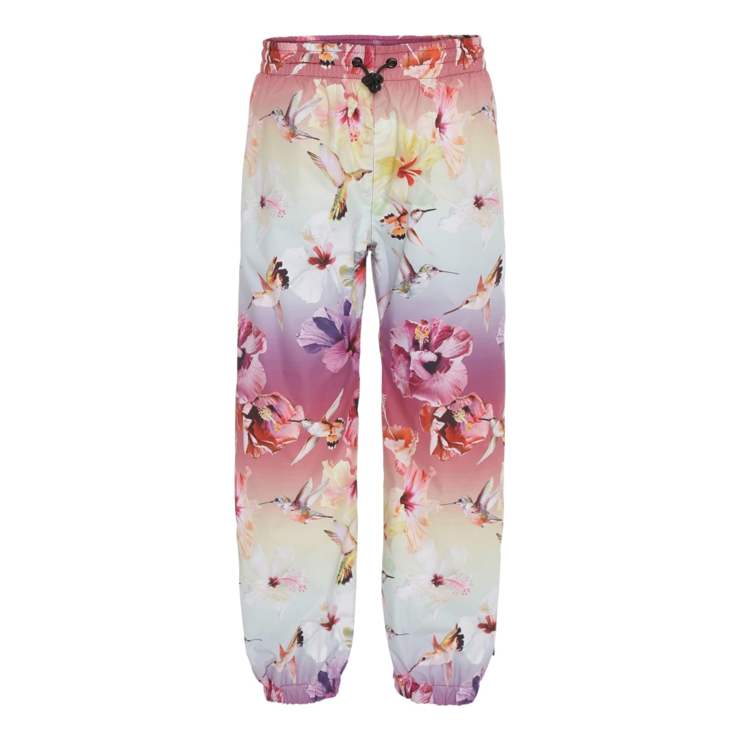 Waits is a pair of lightweight, functional rain trousers in an all-over print with flowers and hummingbirds in beautiful colours. The trousers have elastic at the leg openings and Molo's iconic star reflector on one leg. The rain trousers can be used in all sorts of weather because the fabric is water resistant and breathable. They have taped seams. This product has a water resistant, PFC-free surface treatment (Does not contain, e.g. PFOS, PFOA, etc). Water column pressure: 5.000 mm. breathable: 5.000 g/m2/24hr.