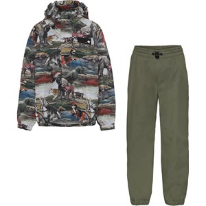 Whalley is a lightweight, functional rainwear set with khaki green trousers and a jacket in a print with prehistoric animals. The jacket has a covered zipper to protect against wind and rain, taped seams, detachable hood and two front pockets. The trousers have elastic at the waist and legs. Both the jacket and the trousers have Molo's iconic star reflector on the back. This rainwear set has a water resistant, PFC-free surface treatment (Does not contain,e.g. PFOS, PFOA, etc). Water column pressure: 5.000 mm. breathable: 5.000 g/m2/24hr.