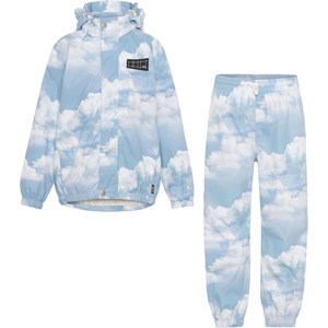 Whalley is a lightweight and functional rainwear set in a light blue sky print. The rain jacket has a covered zip closure to protect against the wind and rain. It has taped seams, a detachable hood and two front pockets. The trousers have taped seams and adjustable elastic at the legs and waist. Both the rain jacket and the trousers have Molo's iconic star reflectors on the back. This rainwear set has a huge advantage in that it is breathable, so a high activity level won't make the trousers and jacket wet on the inside. This product has a water resistant, PFC-free surface treatment (Does not contain, e.g. PF OS, PFOA, etc). Water column pressure: 5.000 mm. breathable: 5.000 g/m2/24hr.