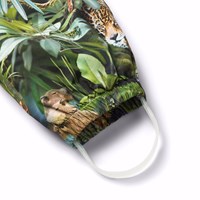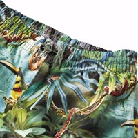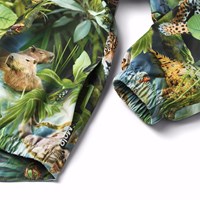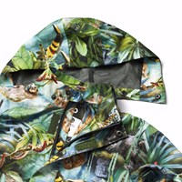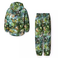 Green wind and waterproof rain set in recycled polyester with an all-over print of a jungle and its colourful animals. The jacket has a regular fit, removable hood, side pockets, elastic cuffs and hem. The trousers have a regular fit, adjustable elastic waist, removable and adjustable rubber straps with Molos logo, and a reflector at the bottom of the leg. The whole set has waterproof seams to keep out the weather.
