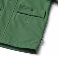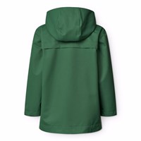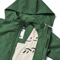 Green wind- and waterproof jacket in recycled polyester with a detachable hood. The jacket has a regular fit, front pockets with button closure, adjustable snap buttons at the wrists, waterproof seams, and a zipper with a flap to keep out the weather. The lining is in soft cotton with an all-over print of smiling faces. The jacket's technical features make it suitable as a raincoat.