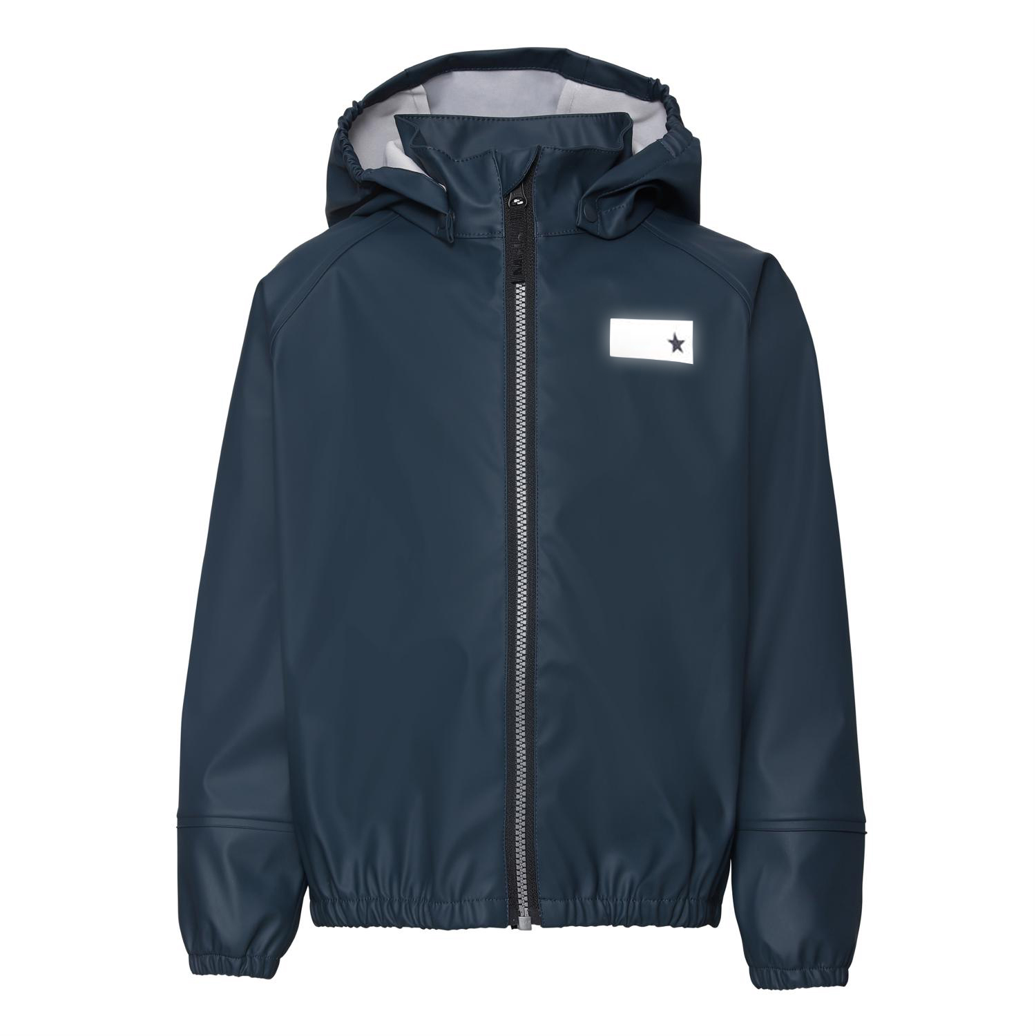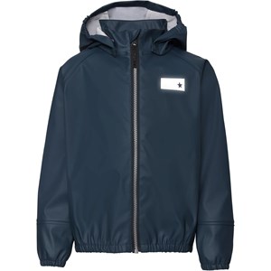 Zan is a dark blue rain jacket. It has a detachable hood and a star reflector on the back for increased visibility in the dark. This product has a water resistant, PFC-free surface treatment (Does not contain,e.g. PFOS, PFOA, etc). Water column pressure: 8.000 mm. Parts of this Molo product are recycled because it is constructed in 50% reusable polyester. The recycled polyester is made of used plastic bottles and other waste materials. The production of reusable polyester uses less resources and emits less CO2, making Molo’s rainwear the sustainable choice.