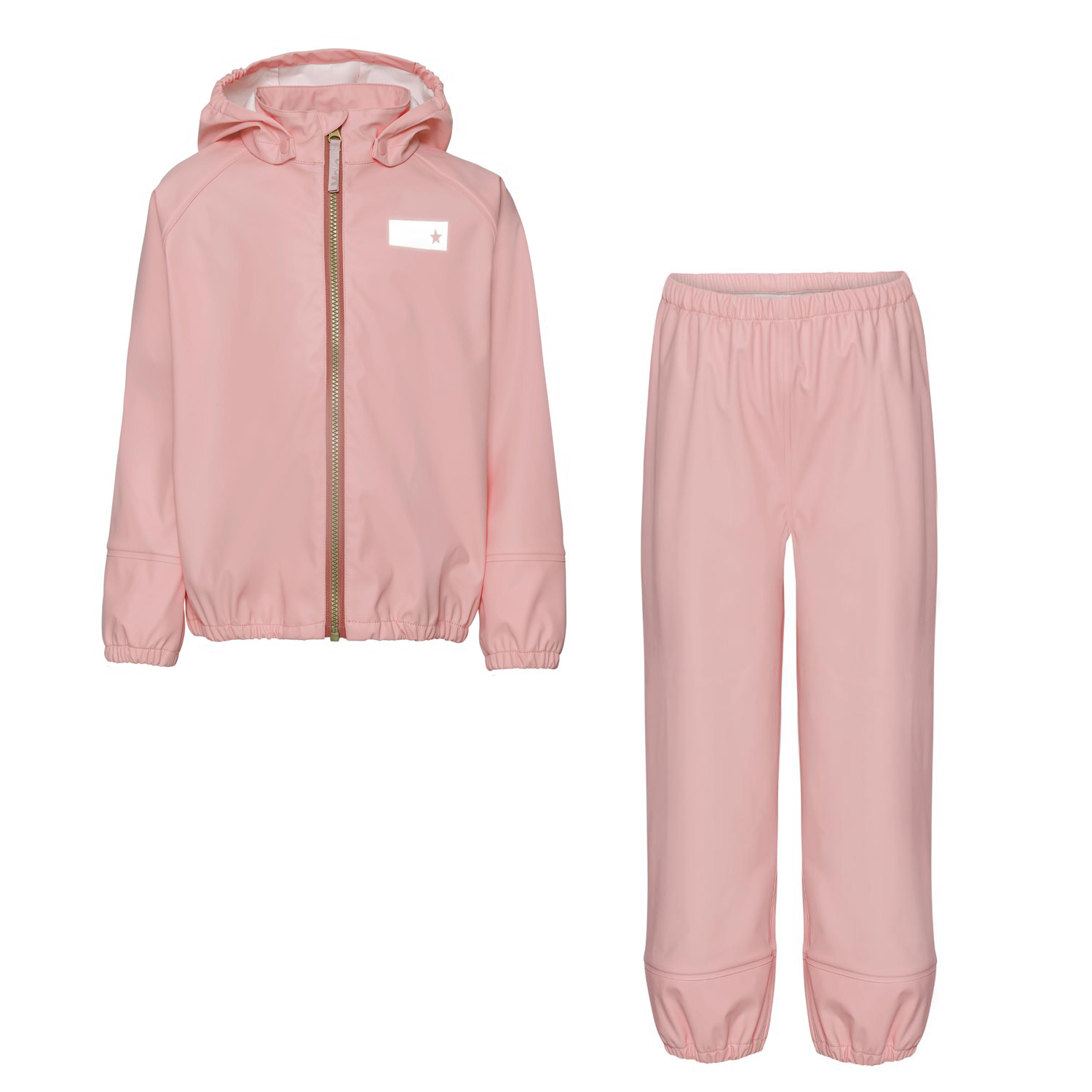 Zet is a rose coloured rainwear set. It has a detachable hood and zip closure on the front. The trousers have elastic at the waist and legs. Both the jacket and trousers have Molo's iconic star reflectors on the back. This product has a water resistant, PFC-free surface treatment (Does not contain,e.g. PFOS, PFOA, etc). Water column pressure: 8.000 mm. Parts of this Molo product are recycled because it is constructed in 50% reusable polyester. The recycled polyester is made of used plastic bottles and other waste materials. The production of reusable polyester uses less resources and emits less CO2, making Molo’s rainwear the sustainable choice.