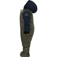 Hebe is a warm baby snowsuit or pram suit in green with dark blue sleeves. It has a detachable hood and two zippers on the front to make it easy to get on and off. The snowsuit has detachable feet and sleeves that pull down for mittens. The outer fabric is made in a windproof, waterproof and breathable fabric and the lining is 100% recycled. It does not have taped seams. This product has a water resistant, PFC-free surface treatment (Does not contain, e.g. PFOS, PFOA, etc).