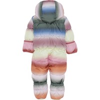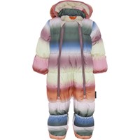 Hebe is a warm baby snowsuit or pram suit in a pastel rainbow print. It has a detachable hood and two zippers that make it easy to get on and off. It has detachable feet, and it hsd sleeves that can be pulled out into mittens. The snowsuit is made in a windproof, waterproof and breathable materials, but it doesn''t have taped seams. Hebe is lined with technical down, called pearl padding, which makes it extra soft, retains heat and has a down-like feel. This product has a water-resistant, PFC-free surface treatment (Does not contain, e.g. PFOS, PFOA, etc). Water column pressure: 5.000 mm. Breathable: 5.000 g/m2/24hr.