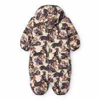 Water-repellent quilted suit in recycled polyester for the little ones, with a light lining, brown edges, and a print of dogs in brown shades. The suit features a detachable hood, a stand-up collar, and a long zipper with a chin guard, making it easy to put on and take off. Additionally, the suit has a recycled polyester filling that provides even softness and optimal thermal insulation, while the water-repellent surface is free from PFOS and PFOA.