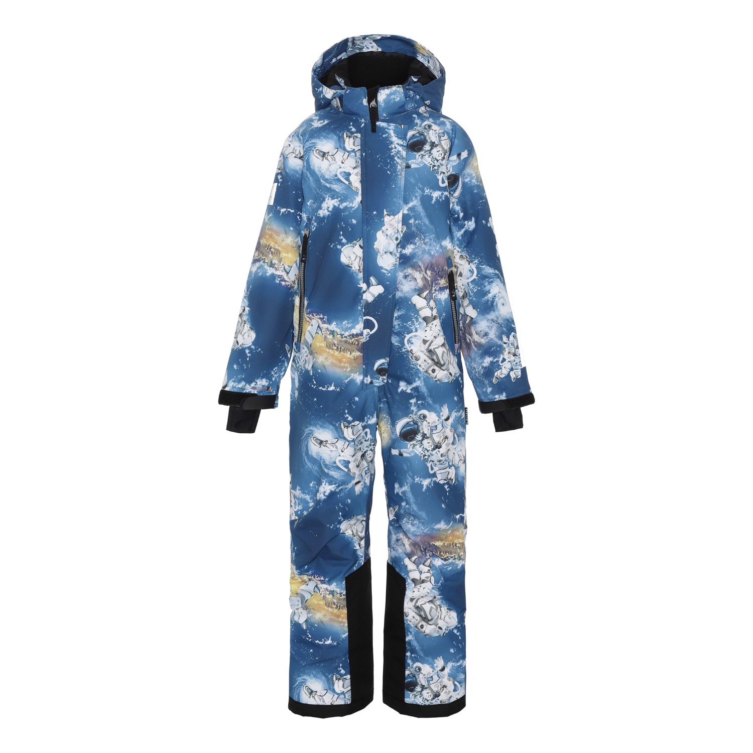 Hux is a snowsuit in blue with an astronaut print. The snowsuit has many functional details and is perfect for skiing. Hux is perfect for extremely cold days but also ordinary winter days. The high level of breathability helps regulate a child's body temperature so it does not become too cold or over heated. On warmer winter days, a child can wear the jacket with a thin under layer, but on extremely cold days, you can add an extra layer underneath. Hux is also a good choice for less active moments. The snowsuit has a detachable hood, a zip front closure with placket, reflectors on the sleeves and legs, a snow flap at the legs with room for ski boots and rubber stirrups at the feet. Hux also has zip pockets on the front and a pocket on the sleeve for a lift pass. The snowsuit is windproof, waterproof and breathable and has taped seams. The outer fabric is made from 45% recycled polyester, the 3M™ Thinsulate™ padding from 83% recycled polyester and the lining from 100% recycled polyester. This product has a water resistant, PFC-free surface treatment (Does not contain, e.g. PFOS, PFOA, etc). Water column pressure: 15.000 mm. Breathable: 15.000 g/m2/24hr.
