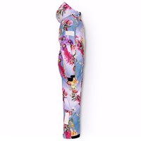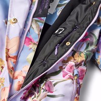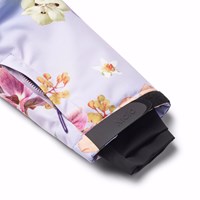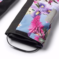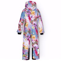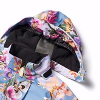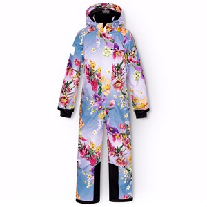 Blue and purple snowsuit for a cold winter or ski holiday in recycled polyester with a print of beautiful flowers in fresh colours. The snowsuit has a detachable lined hood with an extra elastic edge to keep it in place on the head, as well as a zip on the front with a flap to keep wind and water out. There is also elastic around the waist and wind and snow cuffs at the sleeves and leg openings to keep snow, rain, and wind out. Additionally, the snowsuit has an extra adjustment at the leg opening and uses a durable material on the inside, ensuring that the snowsuit fits perfectly over ski boots or winter boots and extends its lifespan. The snowsuit has reflectors on both the sleeves and legs to increase visibility in traffic. The snowsuit is lined with 3M™ Thinsulate™, which provides the child with greater mobility due to its lightweight. There are front pockets, an inner pocket, and a small pocket on the sleeve for a lift pass, all with waterproof zippers.  Features: Windproof, waterproof, and breathable Water column pressure: 20,000mm. Breathability: 20,000 g/m2/24h Waterproof seams 3M™ Thinsulate™ insulation PFC-free (PFOS and PFOA) Reflectors on legs and arms to increase visibility in traffic Detachable hood with extra elastic edge Fleece lining on knees, bottom, and back for extra insulation in exposed areas Snow cuffs at sleeve and leg openings Fleece lining in pockets