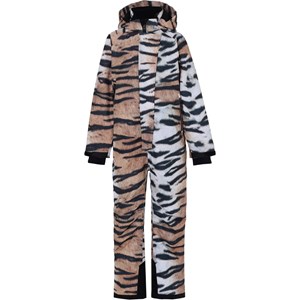 Hux is a snowsuit in a tiger print with many functional details. It is perfect for skiing. The snowsuit has a detachable hood, a zip front closure with placket, reflectors on the sleeves and legs, a snow flap at the legs with room for ski boots and rubber stirrups at the feet. Hux also has zip pockets on the front and a pocket on the sleeve for a lift pass. This snowsuit is constructed in a windproof, waterproof and breathable quality and has 3M™ Thinsulate™. It has high quality fleece in vulnarable places and taped seams. This product has a water resistant, PFC-free surface treatment (Does not contain, e.g. PFOS, PFOA, etc). Its water column pressure and breathability has been improved and is now: water column pressure 15.000 mm and breathability: 15.000 g/m2/24hrs.