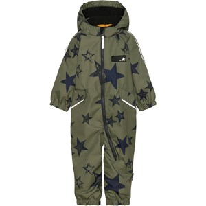 Hyde is Molo's new unisex snowsuit for small children in green with a star print. It has reflective piping and Molo's iconic star reflectors on the side and on the back. The snowsuit also has a slanted zip closure on the front. Hyde is windproof, waterproof and breathable and has taped seams. The lining and the interlining is 100% recycled and made of recycled plastic bottles. This product has a water resistant, PFC-free surface treatment (Does not contain, e.g. PFOS, PFOA, etc). Water coloumn pressure: 12.000 mm and breathable: 8.000 g/m2/24hr.