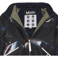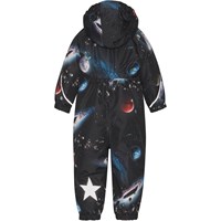 Unisex snowsuit for young children. It's perfect for everyday wear and active children. The snowsuit has many qualities like extremely high-water column pressure and breathability that keeps a child warm and dry in the cold months. The snowsuit is a part of Molo’s 'Outdoor Proof' collection, which is outerwear for more moderate winter weather. It lives up to Molo’s high standards for its outerwear with the same functional details and quality fabrics that Molo is known for. This snowsuit is, of course, also produced in responsibly recycled materials. This Hyde is in dark blue with planets.