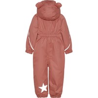 Hyde is Molo's new unisex snowsuit for small children in rose with a star print. It has reflective piping and Molo's iconic star reflectors on the side and on the back. The snowsuit also has a slanted zip closure on the front. Hyde is windproof, waterproof and breathable and has taped seams. The lining and the interlining is 100% recycled and made of recycled plastic bottles. This product has a water resistant, PFC-free surface treatment (Does not contain, e.g. PFOS, PFOA, etc). Water coloumn pressure: 12.000 mm and breathable: 8.000 g/m2/24hr.