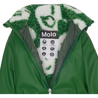 Unisex snowsuit in rubber, which is perfect for all sorts of everyday outdoor adventures and challenges. The snowsuit is a part of Molo’s new ''Rubber Excellence'' outerwear collection, which keeps your child dry in all sorts of weather. The snowsuit is completely waterproof and has been developed with an innovative, high level of breathability for natural rubber. The snowsuit''s outer fabric is dirt-repellent, making it easy to clean. Rubber Excellence has a high level of insulation and is suitable for moderately cold winters. This Paco snowsuit is in green with a sweet print of smiley faces.